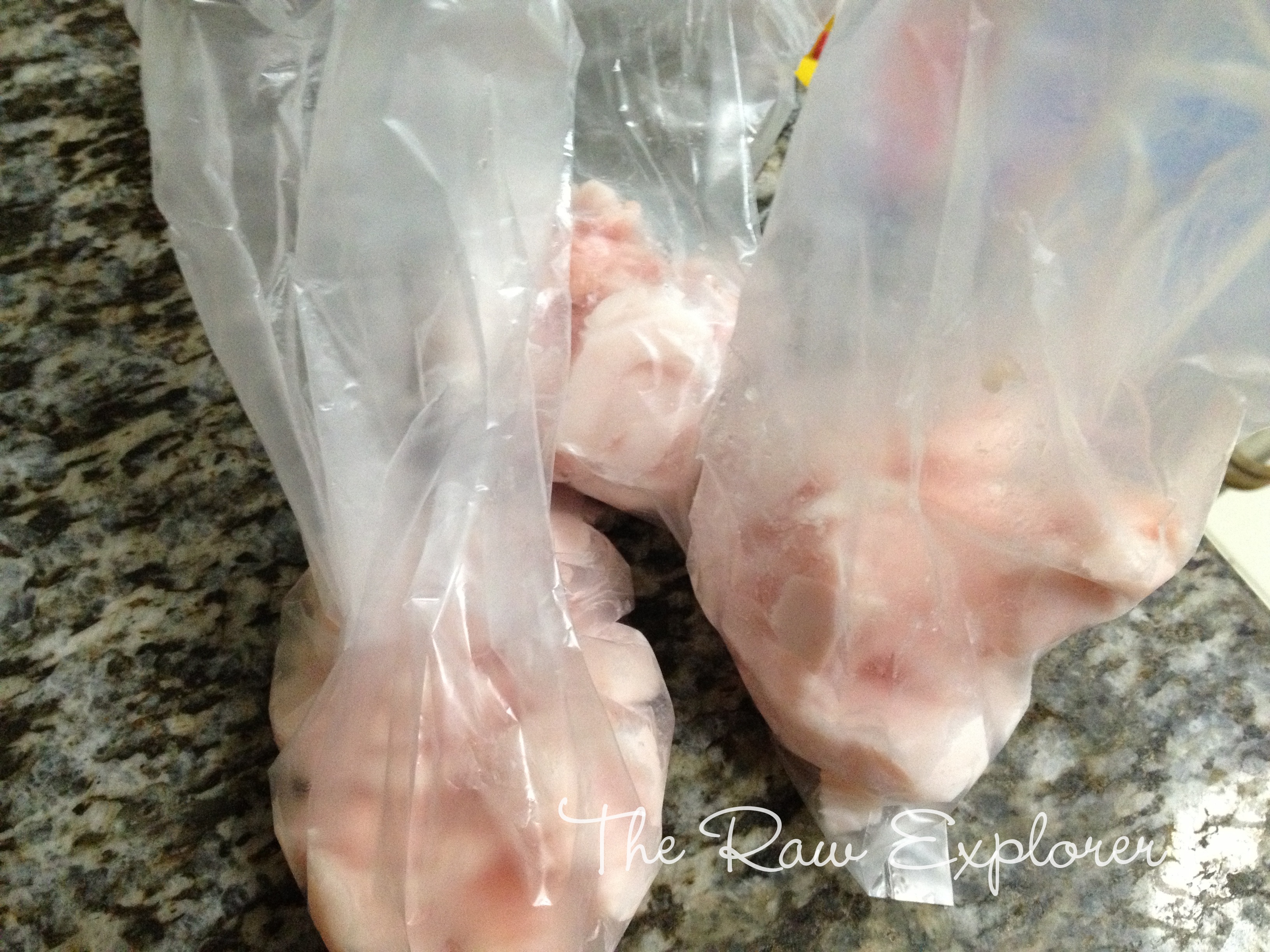 Separate them into baggies to freeze, and freeze by portion. Your portion could be by meal, or by week, depending on what you prefer. Cold bits of fat is always easier to handle because they don’t slip and slide around, very irritating. So if you need to mince your cubes (they usually come in cubes, but if you’re unlucky there will be more tiny squishy bits) do it quickly when you just got them out of the fridge.
