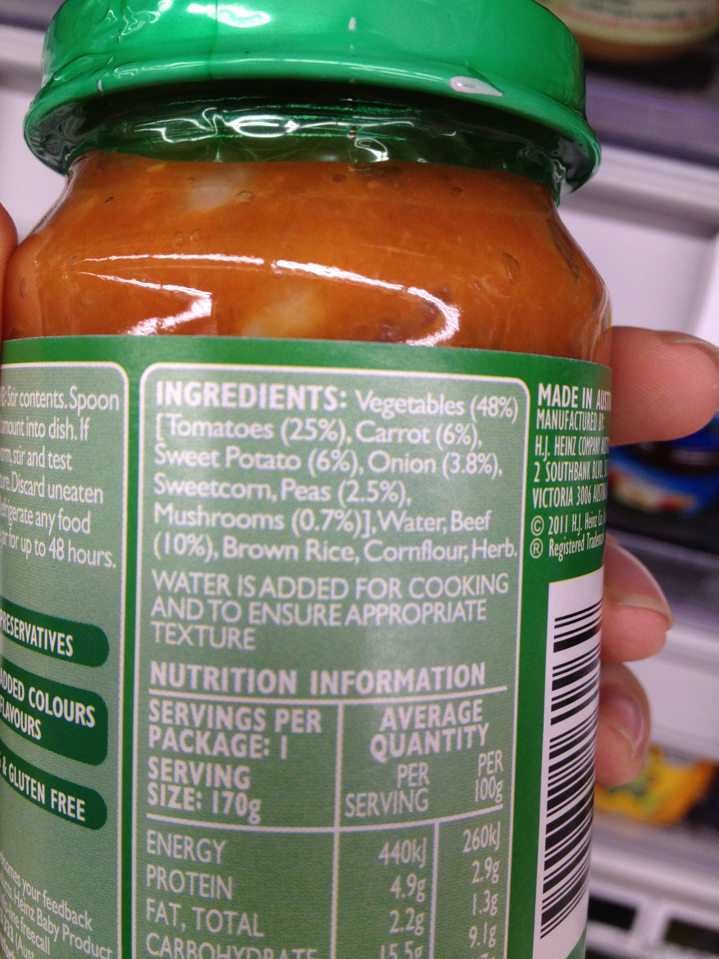 As you can see, beef ranks towards the end, and there is cornflour and herb. I could still…overlook the cornflour and brown rice if I were desperate, but I can’t overlook the herb because it’s unnamed! It could be anything–and it could be harmful. So, nope! Sorry Heinz Beef Casserole!
