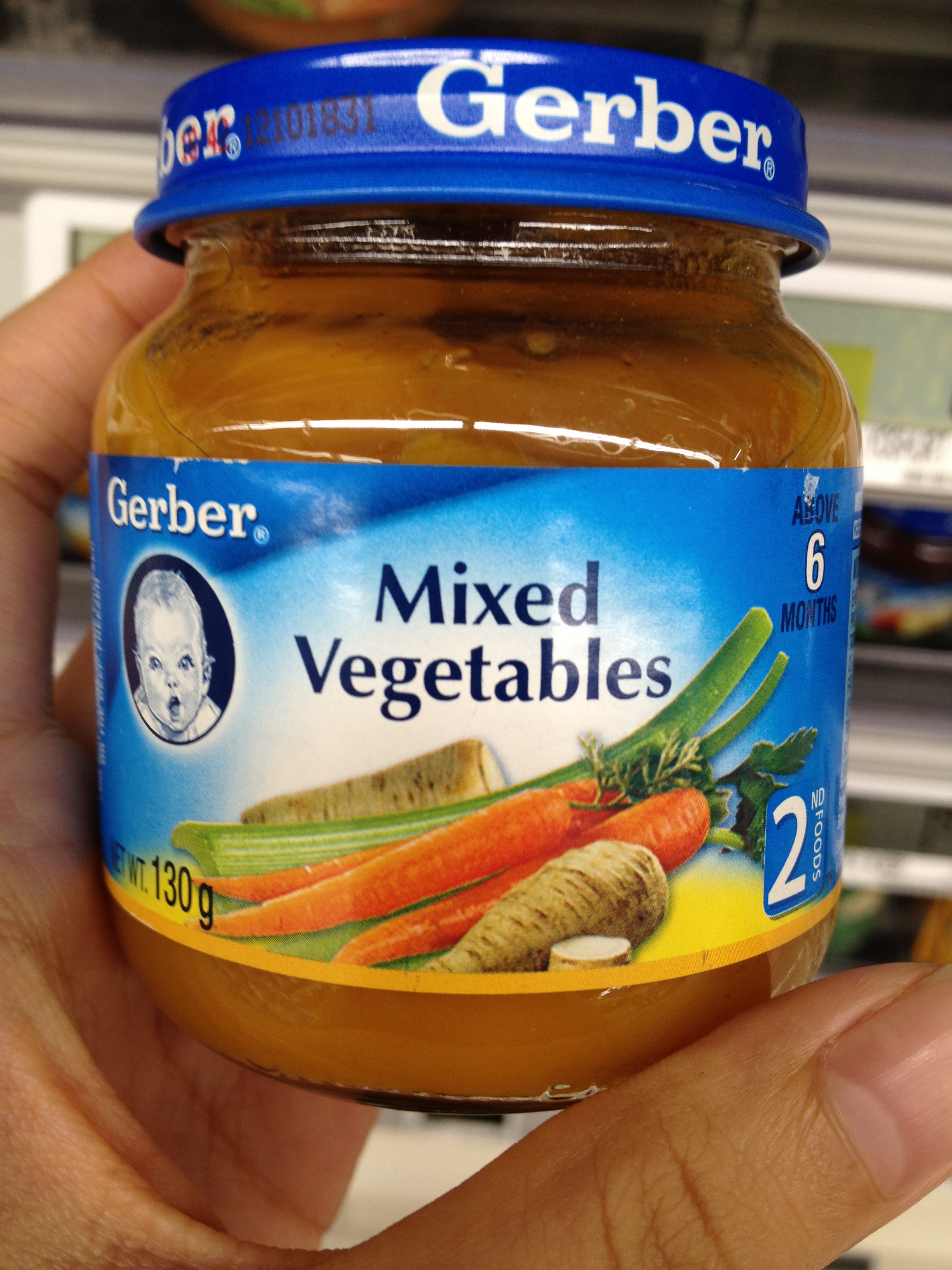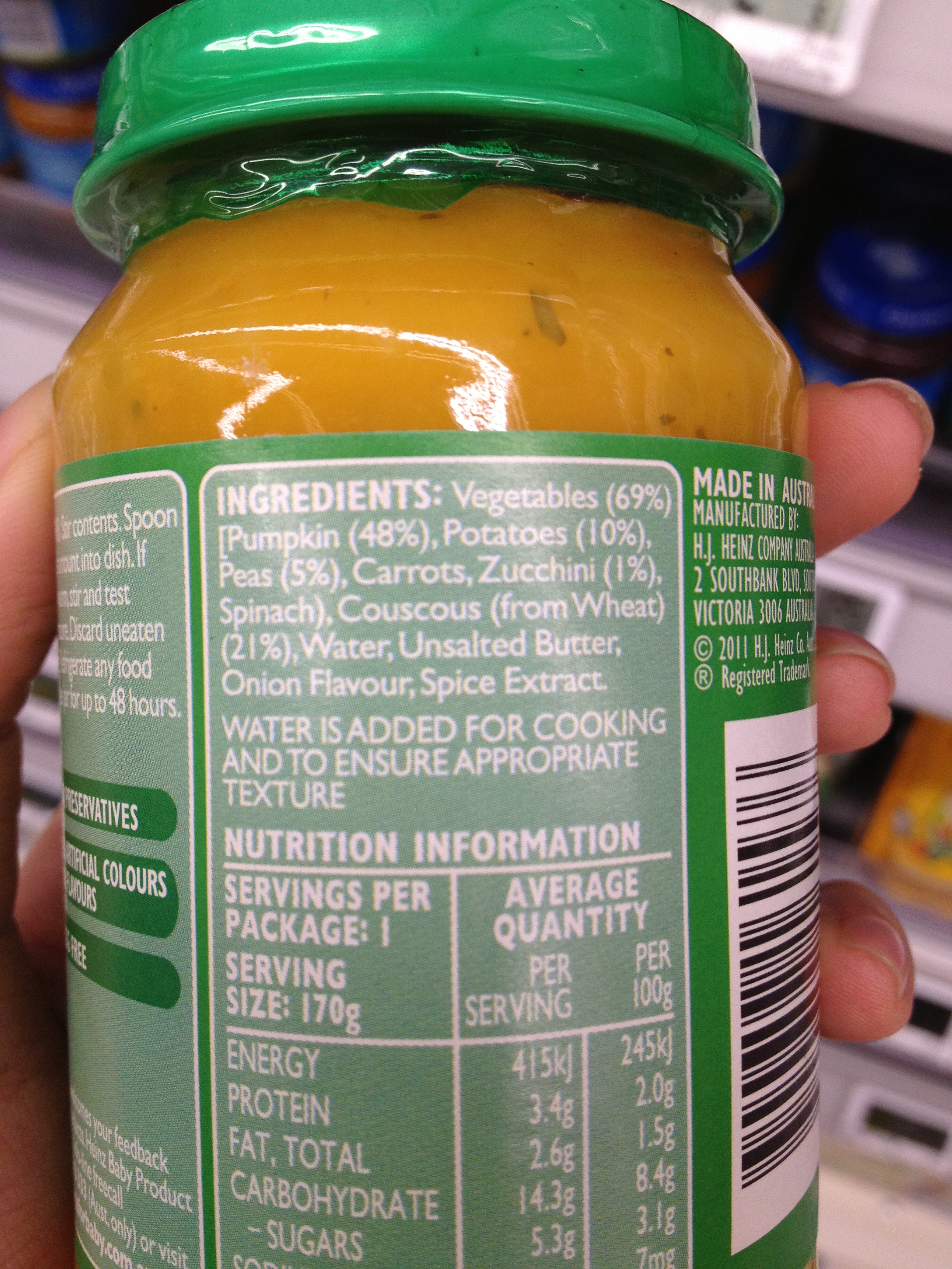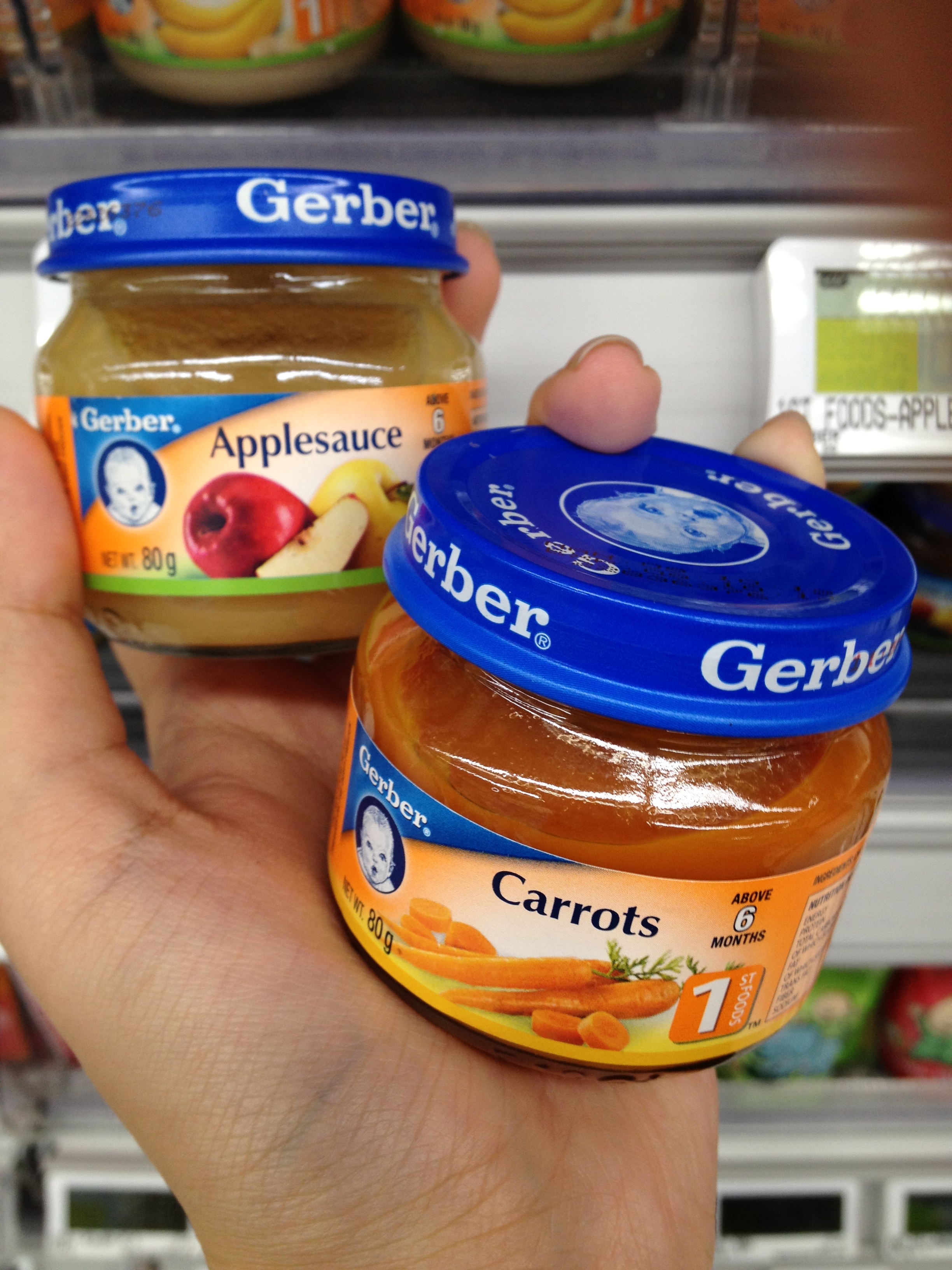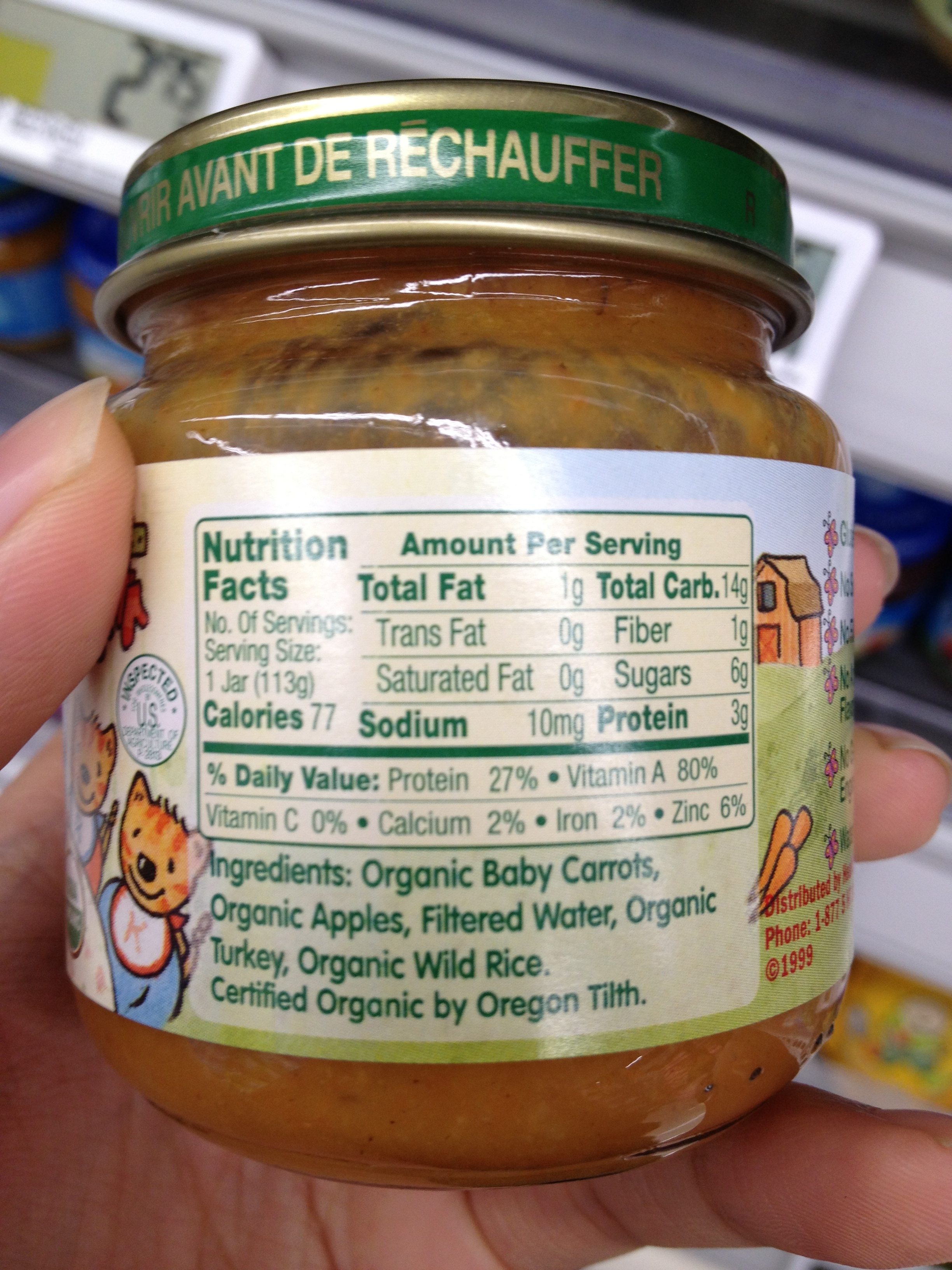 So let’s go look at some labels. My favourite is Gerber’s baby food. You have to be careful, though, read the ingredients!