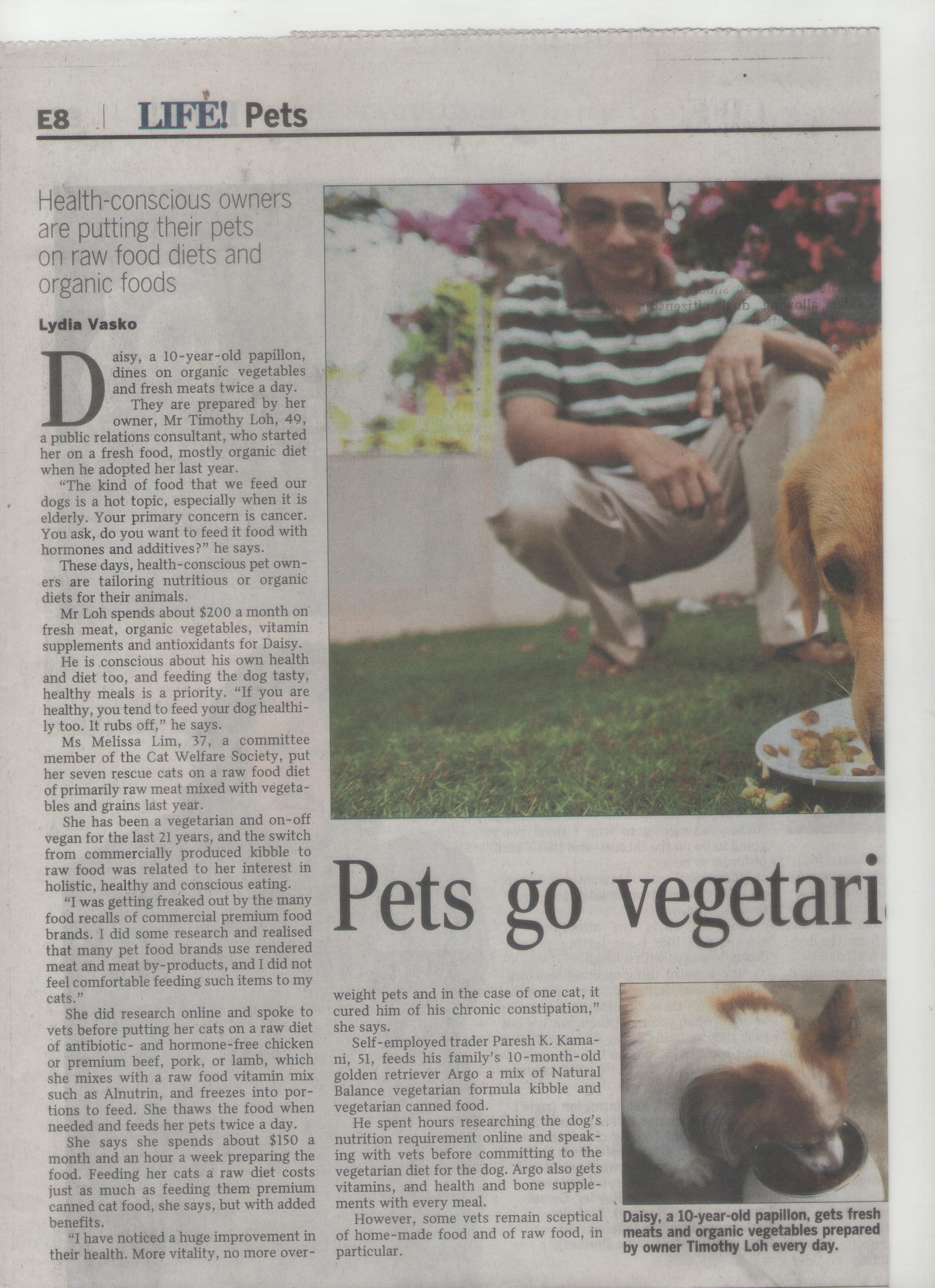 I refer to your article on Saturday, April 4, 2013, ‘Pets go vegetarian and organic’. I wish to provide some balance to the article. I come from the Singaporean raw-feeding community–you will find us in places like PetsChannel.com or The Raw Explorer–and I am a long-time raw-feeder.