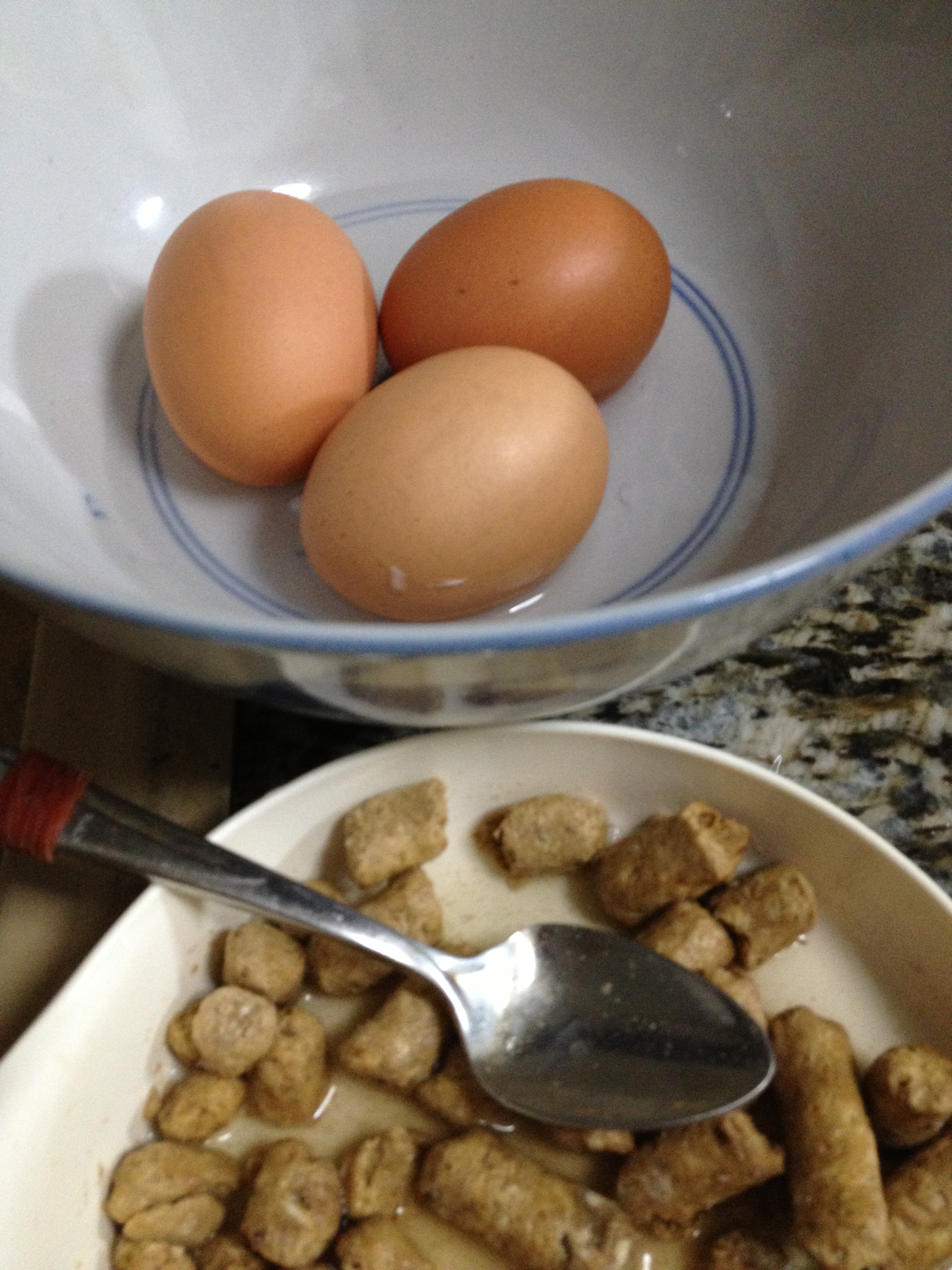 If you like, you can soft boil an egg for your pet. Do this just before you go into the bathroom, should you want to add an egg for Kitty or Fido’s breakfast. I love eggs because it’s nutritious–one of nature’s best foods–and because it’s a lot cheaper than two scoops of K9 Feline Natural per cat!