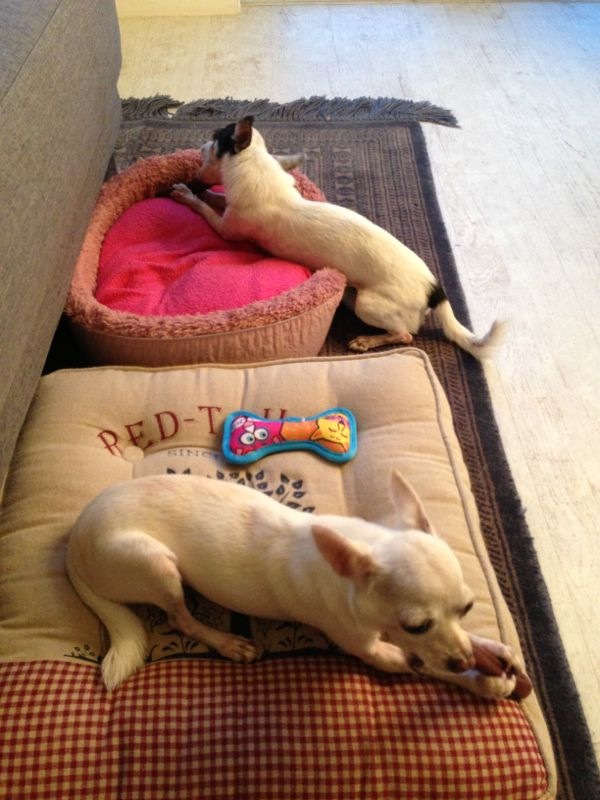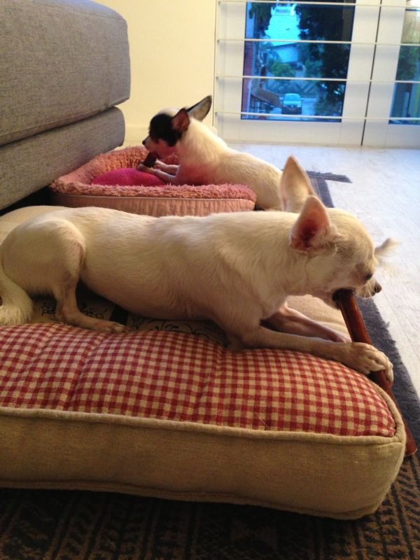 Here are the pampered pups enjoying bully sticks from The Raw Explorer and reclining on the best beds (they have day and night beds, so that makes 6 beds for 3 lucky chihuahuas!)…