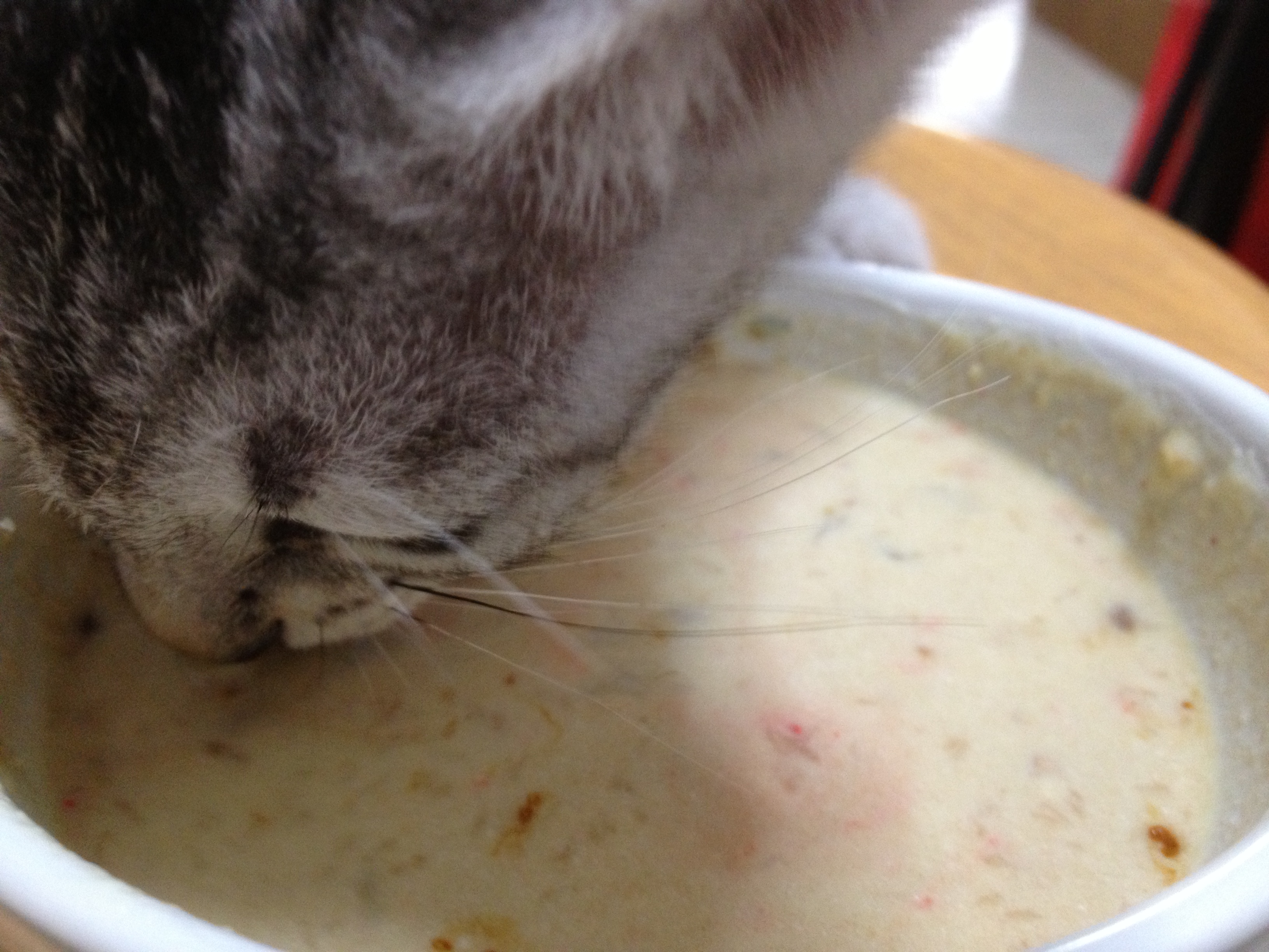 This happens to be Winter’s very first time drinking the soup. If your pet is picky, we suggest that you just try serving milk first, instead of using so many ingredients at once, which may go to waste should your pets reject your little concoction! Serving the soup/milk warm may also encourage Poochie or Kitty to sample a lick.