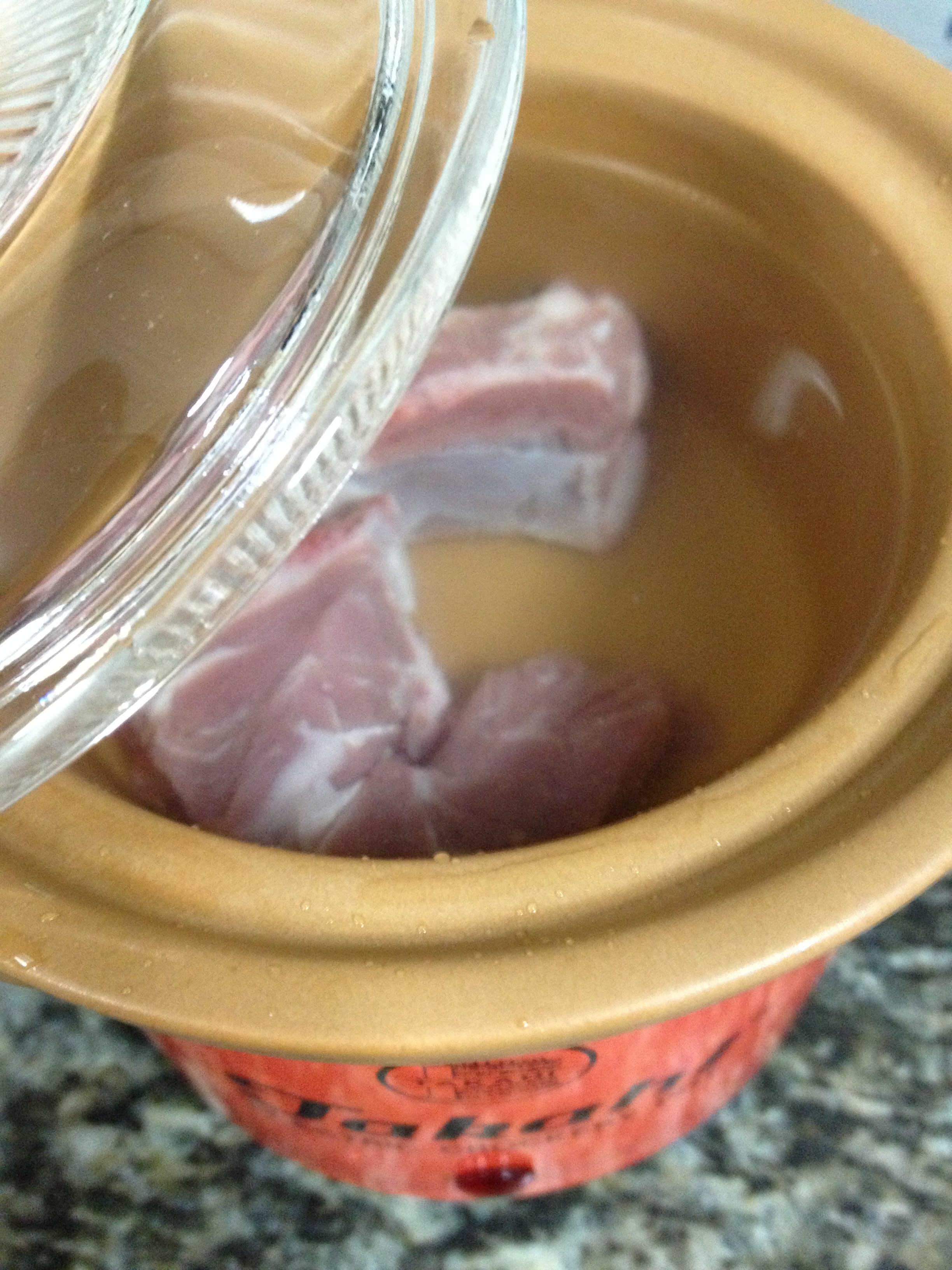Cover with enough water (the less water, the thicker your broth). You’ll probably have to top it up if you, like me, can’t resist lifting the lid to check on the broth.