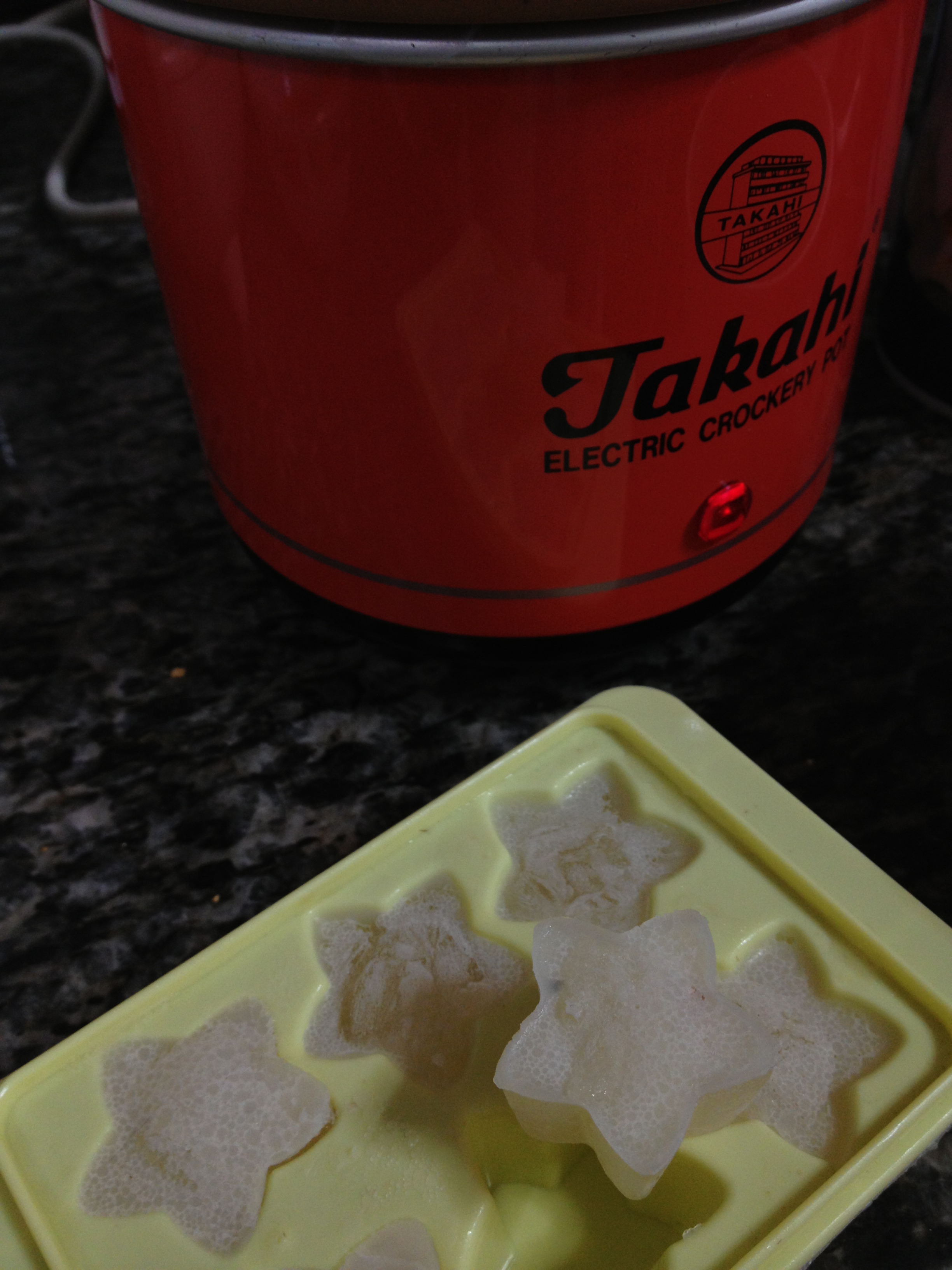 Put into ice cube trays. Our broth-tray is star-shaped because we don’t want to accidentally use them to cool coke or sprite or other soft drinks! haha.