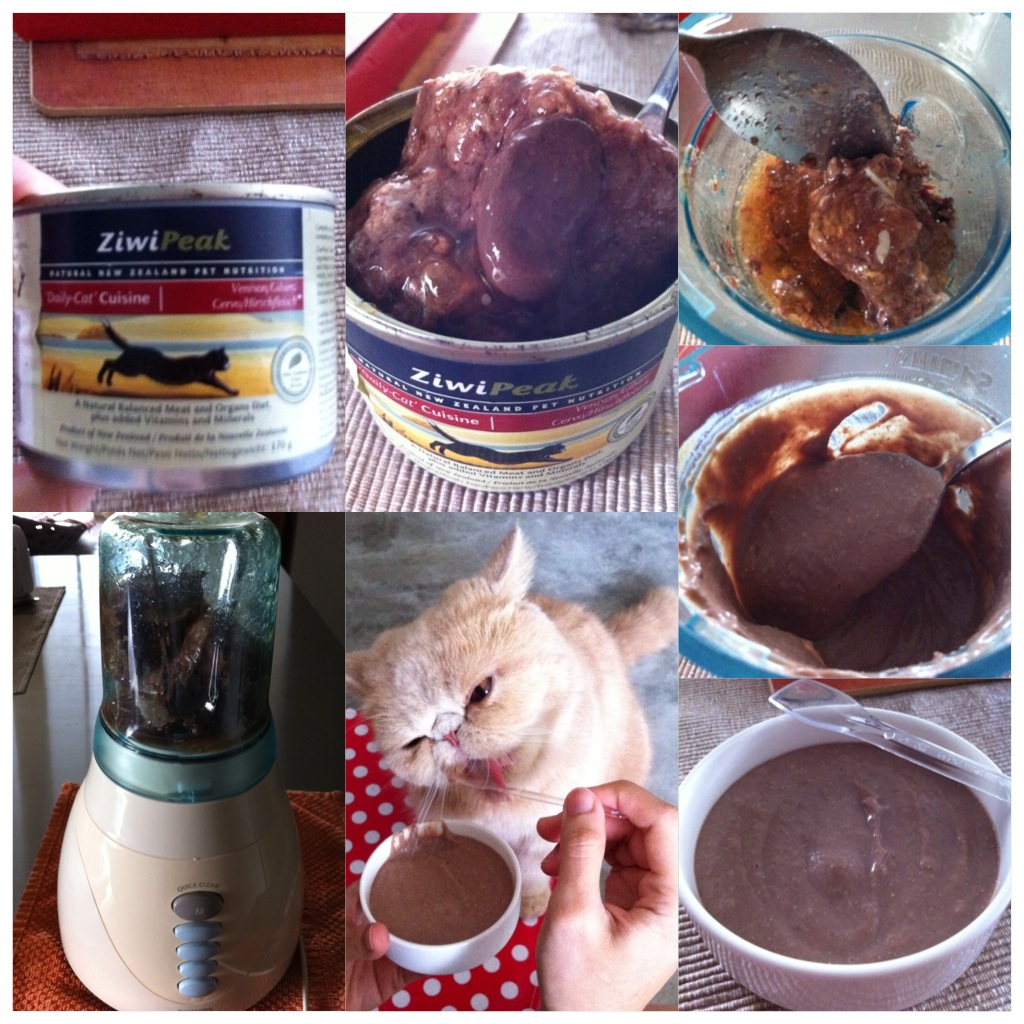Right, lets get back to the Ziwipeak before I went off for a self justification theory earlier blah….blah….. blah…….I’ve put in some pictures for your easy reference on how he’s fed. RA will only have his canned food pureed! Yes you read that correctly. I kid you not, and he meant business! If it’s not properly blended in he’ll refuse to consume it. It’s a sniff and stare blankly at your face before walking in disgust, while cursing under his breath! I usually dunk the whole can in a blender for less than a minute, dividing them in 2 bowls.