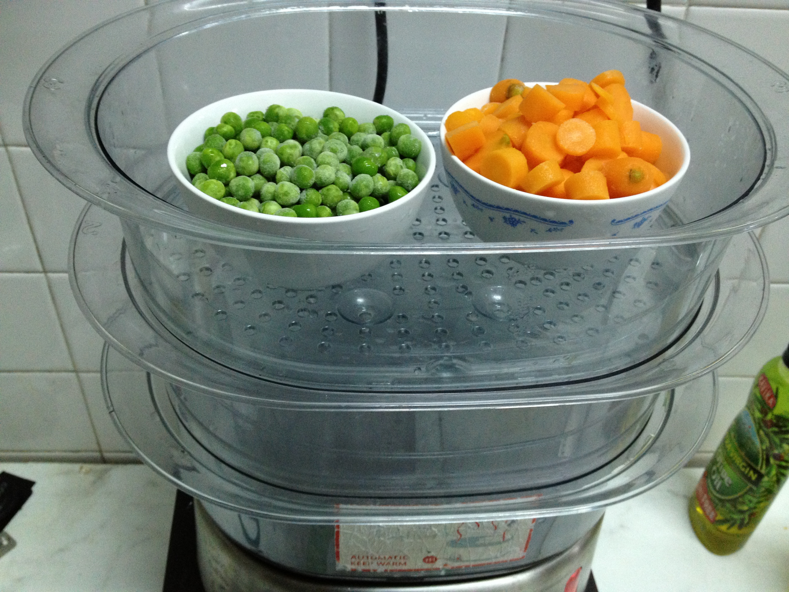 Instead of steaming frozen peas and carrots, simply waiting for the veg to defrost completely works too, so will just blending the veggies. The whole point is to break down the cellulose in veg. In general, freezing, cooking and blending will all work. =)
