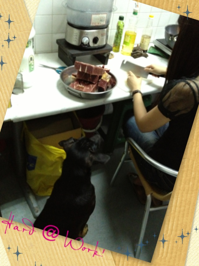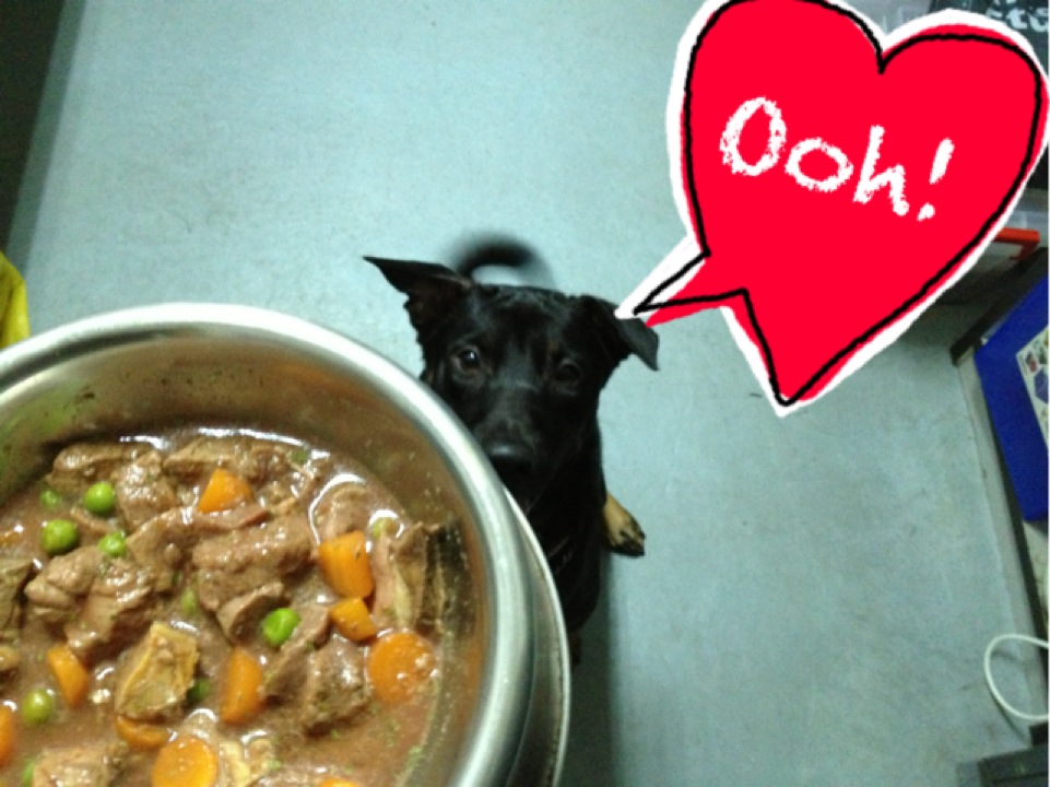 A dog about Jackie’s size should eat about 450 grams (please adjust according to your dog’s needs), and we got about 7 bags in all. Ever since we started feeding him U-stew (because Dad was uncomfortable with feeding him raw then) he shed and scratched less…and the best part was watching him at dinner time! He just got SO HAPPY! Now he is already normally enthusiastic at dinner time, but this new level of joy is something to behold! If he could balance on his hindlegs to get a better sniff of the bowl of stew, he would. This pooch knows what good stuff is haha!