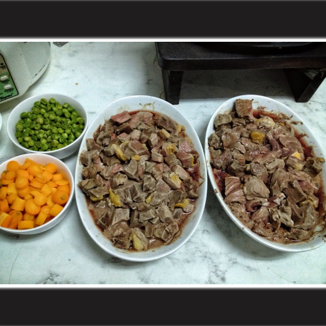 Chopping up the meat while the peas and carrots cooked! This was a breeze because Jackie’s a mid-sized dog (20kg) and honestly I didn’t really have to chop up the cubes because he can easily eat them anyway. But since we chopped the cubes for the cats to make Better In The Raw cat food for them, might as well…just this once…