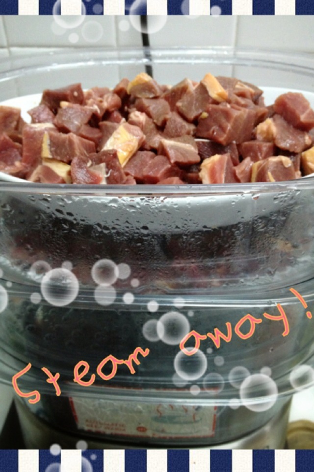 Steam away! This step took us 20min. Be careful not to overcook the meat into shoe leather. Your dog will probably still eat the overcooked meat, but boiling the meat into leather is not the best way to preserve nutrients 😉