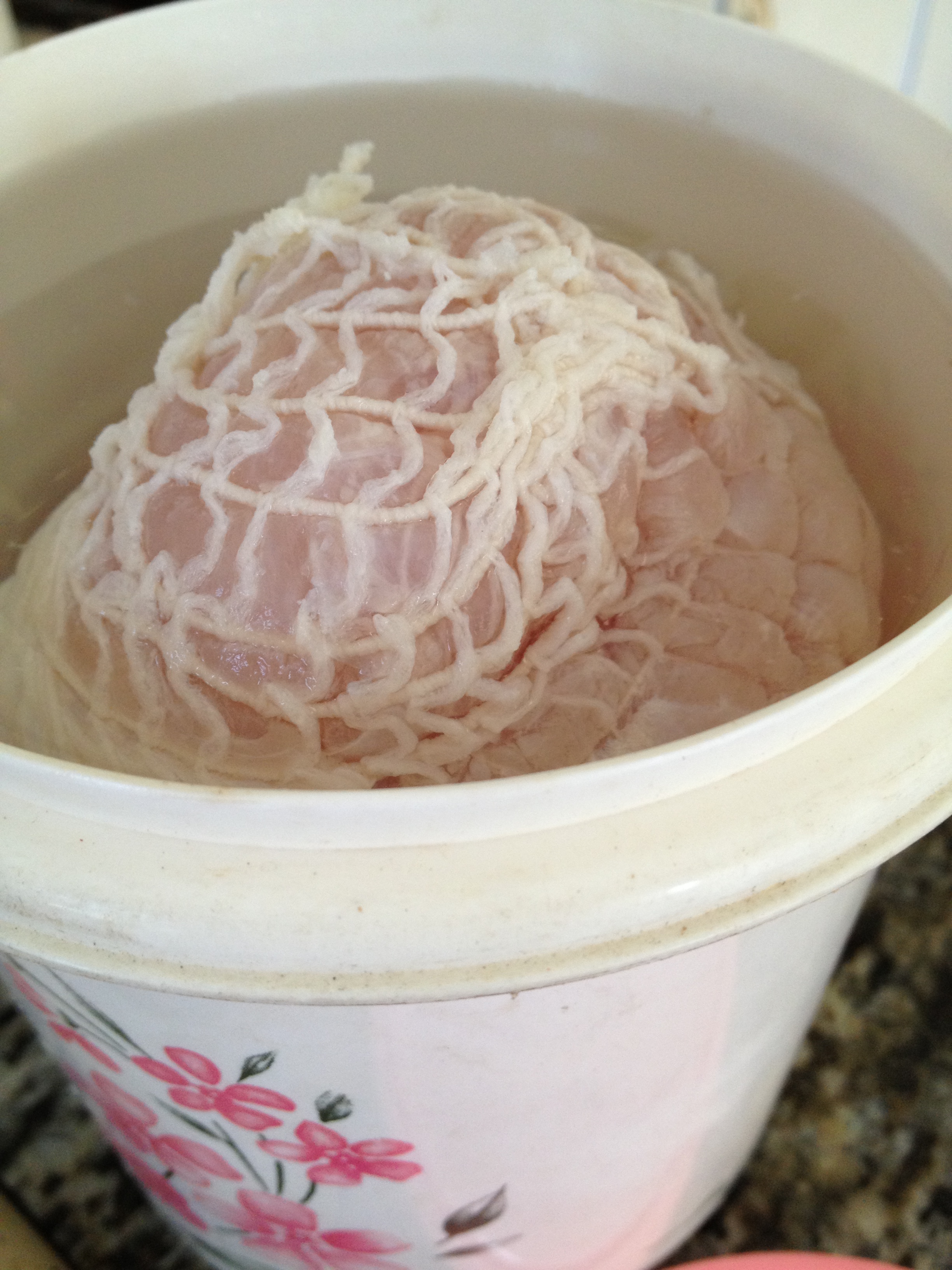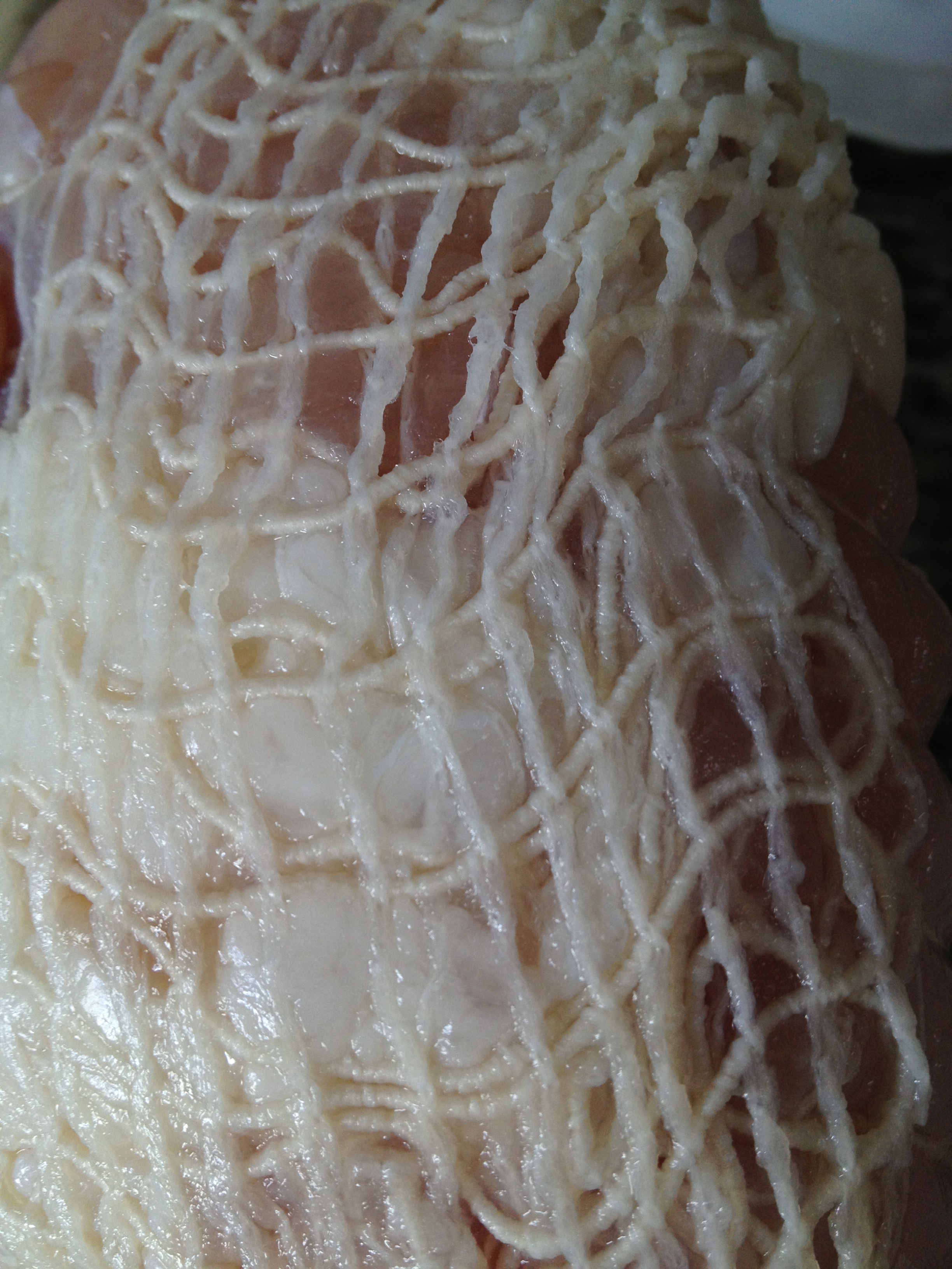 Geez, so much twine! Almost looks like maggi mee! And notice the white parts? That’s all the fat there is. There aren’t any annoying pockets of deep yellow wobbly fats that you find stuck liberally onto chicken here, there, everywhere. The turkey fat comes off cleanly in one big piece… sort of like a big white jacket of fat and all you have to do is peel it off!
