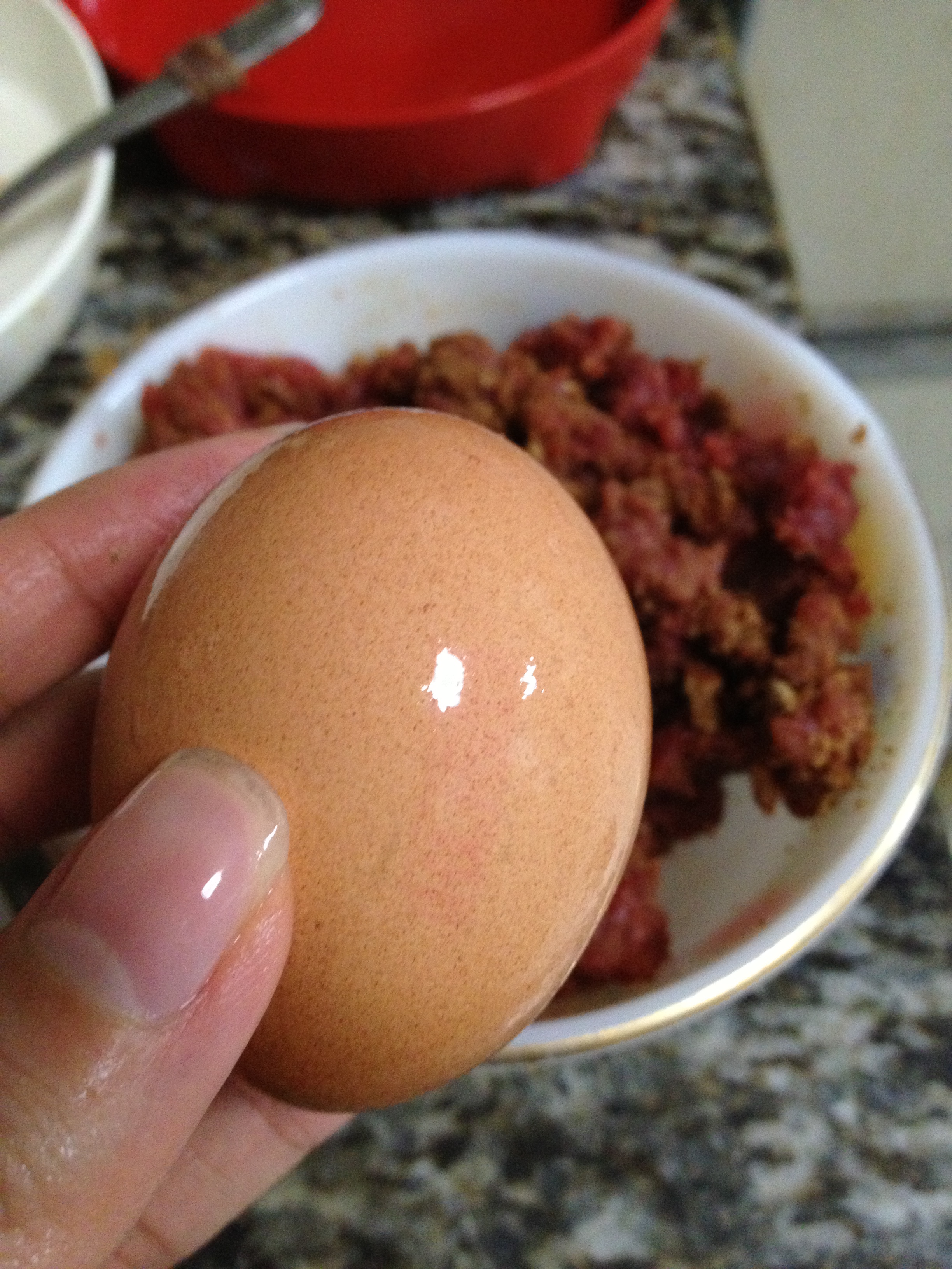 Lining your bowl with meat (while the egg boils)