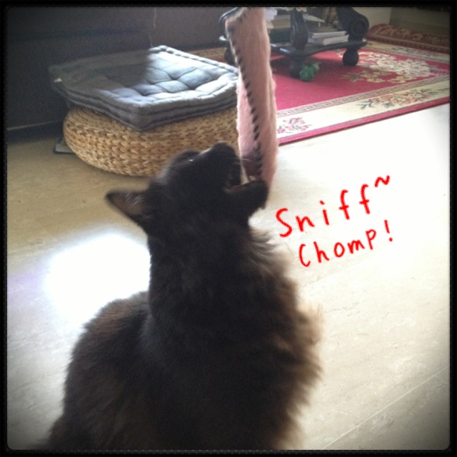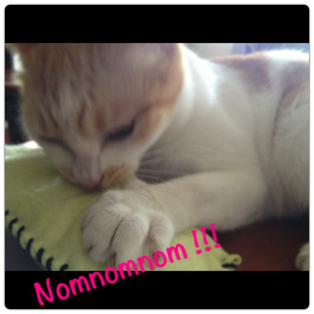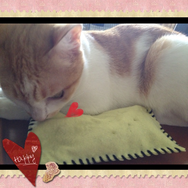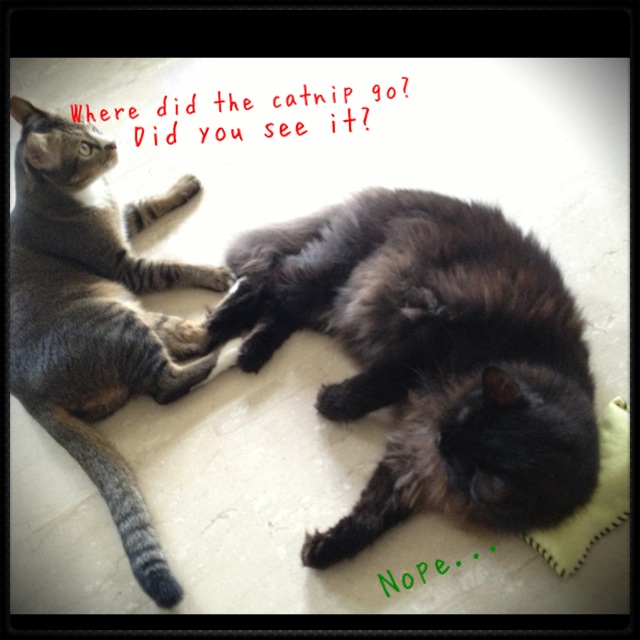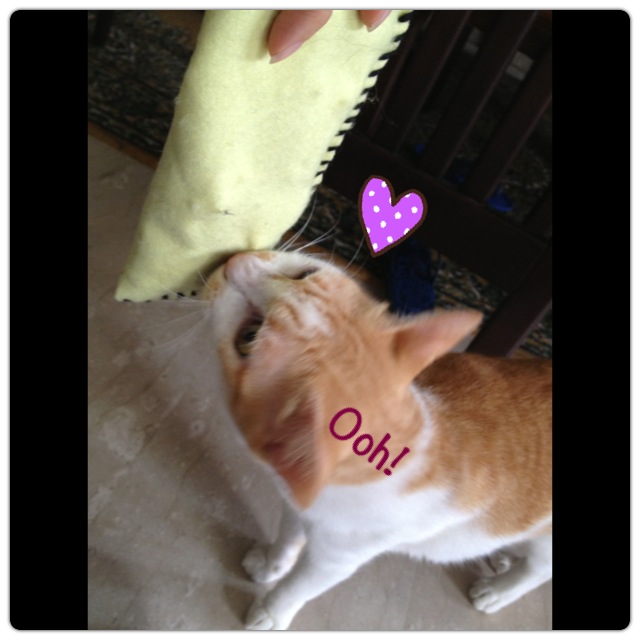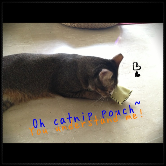 She tried to eat the catnip from the felt pouch. =.=” The good thing about having a catnip vaccum like her around is that even if we give them catnip by scattering dried leaves, she will lick up every bit of the herb. Thanks, cleaner-kitty!