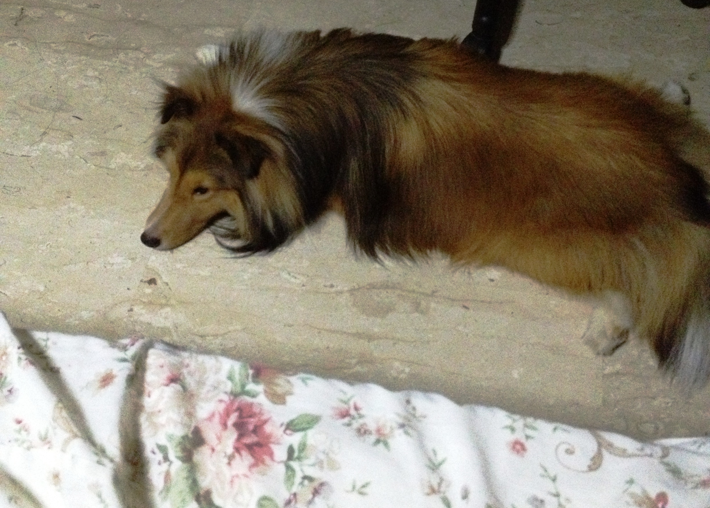 Look at how full and thick his coat was! He was not fat at any time of his life–I’m quite a sticker for weight– and although he hasn’t yet got his dark brown, note that his coat isn’t yellow here. He’s an immature mahogany sheltie here, so his coat isn’t THAT dark yet, but definitely darker than the picture below.